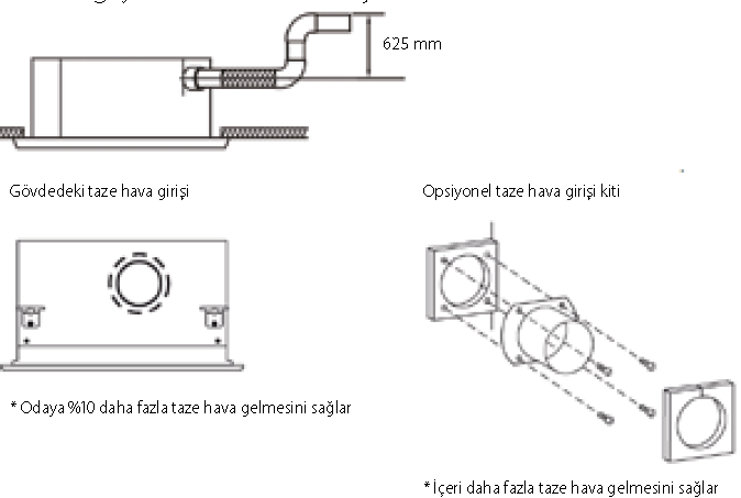 › Asma tavan içerisine dikkat çekmeyecek şekilde monte edilebilir:dışarıdan yalnızca emiş ve üfleme menfezleri görülebilir.