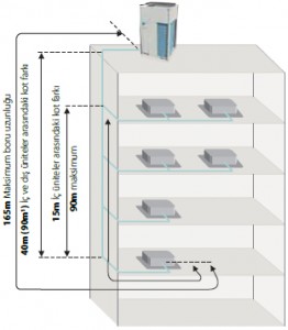 VRV, 165m (190m eşdeğer boru uzunluğu) maksimum boru uzunluğuna ve toplam 1.000m sistem boru uzunluğuna sahiptir. Dış ünitenin iç üniteden yukarıda bulunması durumunda, kot farkı standart olarak 50m’dir. 90m’ye kadar çıkabilir. Dış ünitenin iç üniteden aşağıda bulunması durumunda, kot farkı standart olarak 40m’dir. Maksimum 90m’ye kadar kot farkı mümkündür.